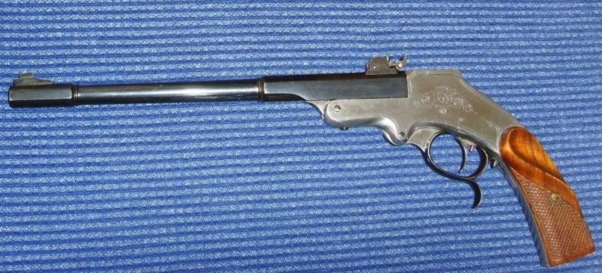 This single shot gallery pistol was made for .22 mm short rimfire and was also available in many others calibers such as 6mm flobert, .22 long, .22lr, 7 mm (K20). The model dates from 1893 and was based on the German patent 73855 of 22 march 1893 for a system of opening the barrel and at the same time that working the action and ejecting the used cartridge by tilting down the barrel.