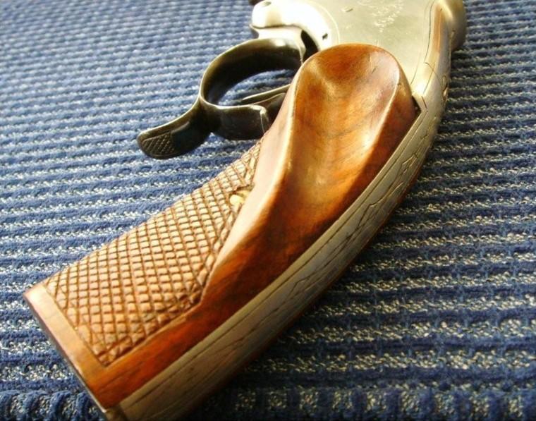 Please note that the wooden gripplate on the left side of the gun has a remarkable provision for the shooter to place his or her thumb on. The reason for this is that in those days it was normal practice to aim and shoot with your arm bent while resting your elbow against your hip, instead of aiming and shooting with ones arm fully stretched in a straight line.