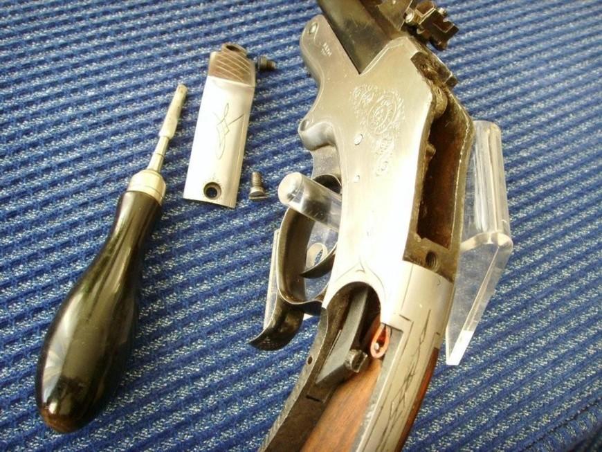 Almost thirty years later, in the 1922 Steigleder sales catalogue, this gun was shown as having double set triggers but without the added 'Swiss' adjustable target sight that is present on the gun in the photo.