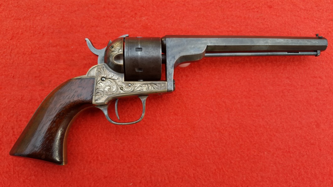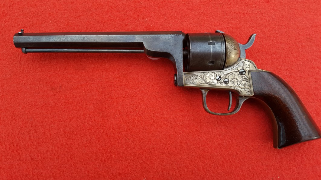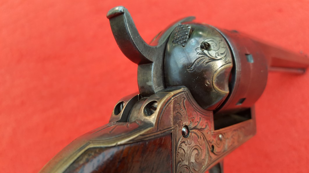 Excellent weapon, featuring a factory hand-engraved brass frame. Without the infringment problem and with a plain frame, the Moore could undoubtedly have seen military use during the Civil War.
