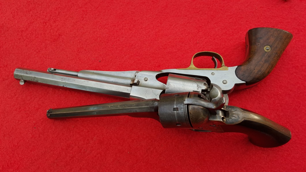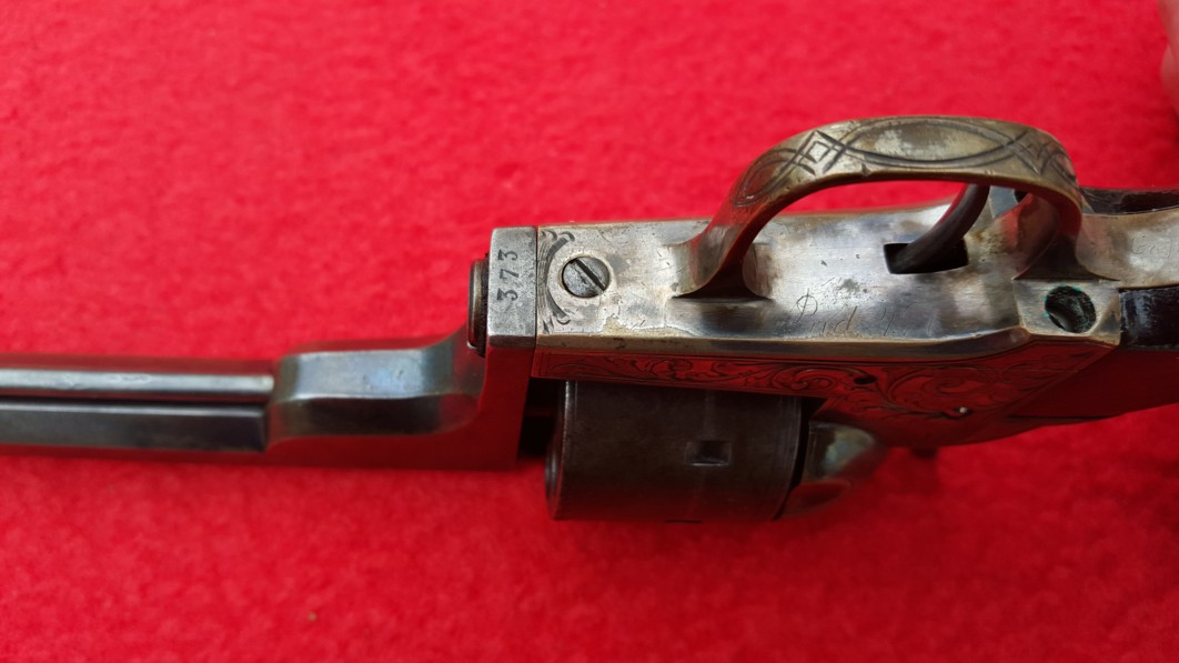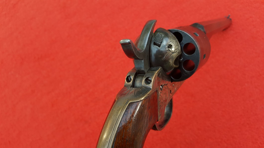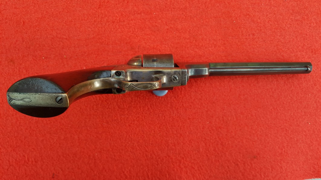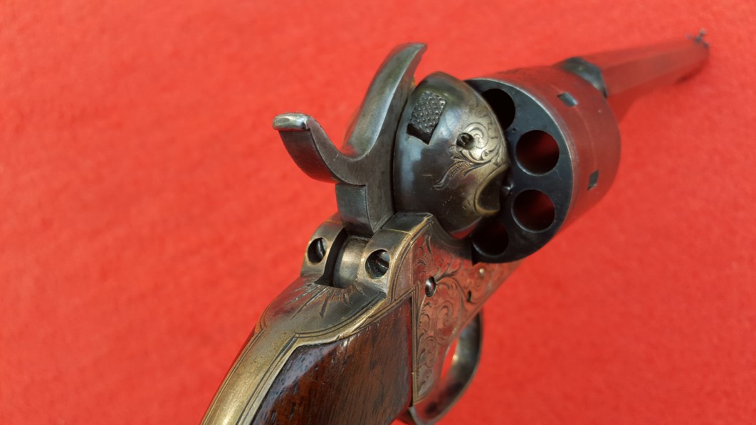 This gun was designed to circumvent the Rollin White/Smith Wesson patent. The chambers loaded from the front with cartridges that held primer in nipples which protruded from the rear of the cylinder.