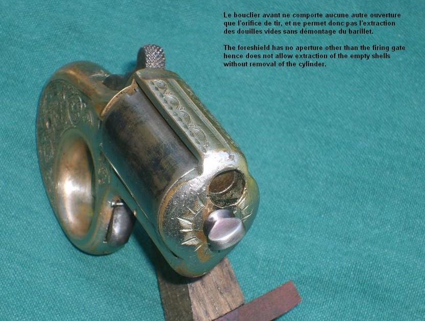 Moreover, apart from the firing gate, there is no aperture in the front shield that could allow use of the pin to push de empty cases out with the cylinder held in place.