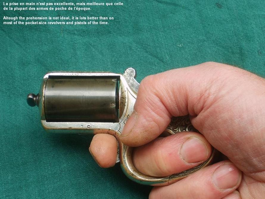 Although not ideal, the prehension is however amazingly better than on most pocket revolvers and pistols of the time, which for esthetical reason invariably present grips that are much too short. Reid adopted a total new orthopaedic concept and created a pocket gun that became popular and reached respectable production for a civilian pocket weapon.
