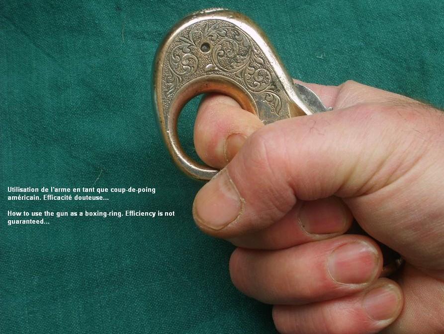 The most remarkable feature of this weapon, however, is the shape of its grip. James Reid wanted to develop a pocket gun that could also be used as a set of knuckles for hand fighting. The result was this unique shape with the central ringhole in the middle of the grip. The gun is very compact and can easily be hidden in a vest pocket.