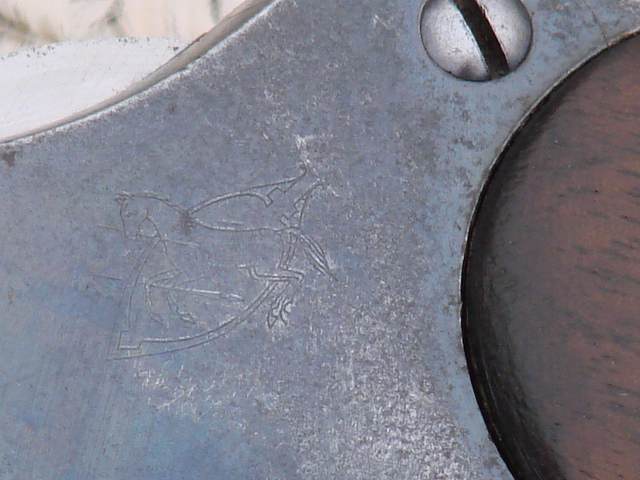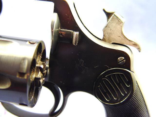 L'exemplaire présenté est donc un 1909 "civil", équipé de plaquettes de crosse en bakélite. Il est au calibre .455 et porte encore certains poinçons britanniques à demi-effacés: poinçons d'attribution régimentaire UE19, "broad arrow" et V couronné sur le châssis - pas de poinçons d'épreuve sur les chambres du barillet.