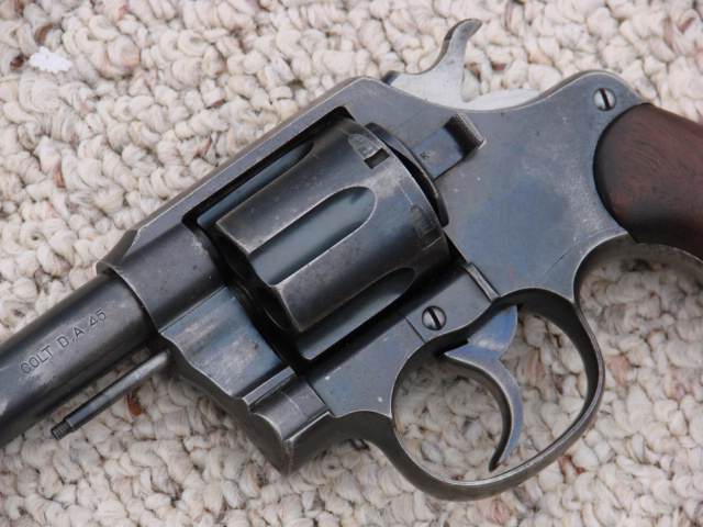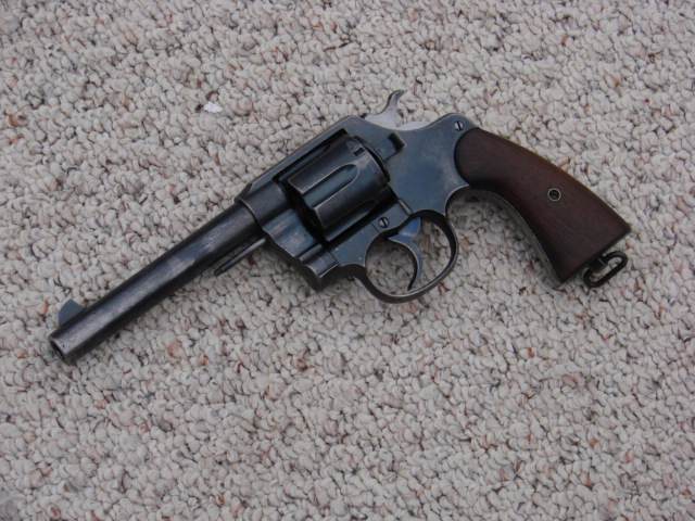 L'arme présentée est un Colt New-Service modèle 1909 (voyez la différence de forme du canon) civil, en calibre .455 Webley (Eley).