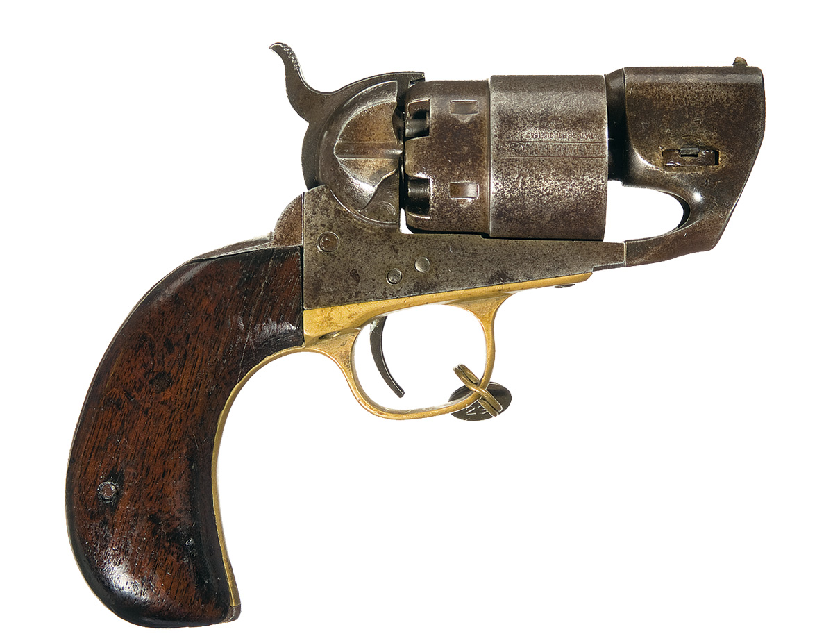 Ce revolver a été fabriqué en 1863 et plus tard le canon a été raccourci à sa longueur courante de 1 ½ pouces approximativement et le levier de chargement enlevé sans remplir le trou. La crosse a été remodelée en tête d’oiseau. Le dessus du canon est marqué "BARNEY". L’armature porte trois vis pour le placement d’une crosse carabine. Le barillet est gravé avec la scène navale de la bataille du Texas et identifié par le numéro de série partiel "7388" et deux initiales d’inspecteur principal "D". L’initiale "C" d’inspecteur secondaire est marquée sur le dessus du fer en arrière de la garde de détente en laiton.