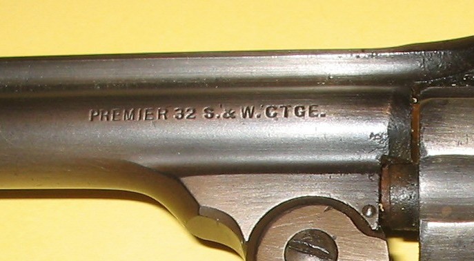 Yours shows some "macho" logos on the grips; the mention "Premier .32 S&W CTGE" refers to the ammunition that was the best for that weapon. The maker simply advises that the .32 S&W cartridges (CTGE) made by Premier were the best to use.