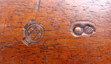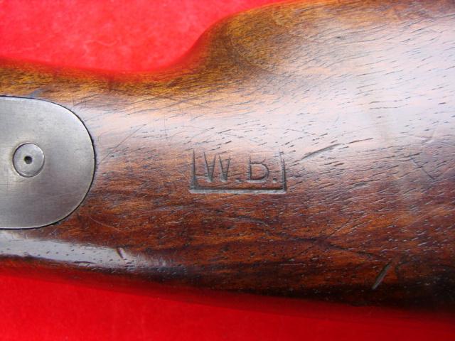 The receiver and barrel display a couple of English commercial proof marks. The right side of the buttstock displays two markings, "Flaming Grenade" and "Two Crossed Cannons and a Circle". The left side of the buttstock displays, "WB" (in a rectangular). The buttplate displays a number, "A1222".