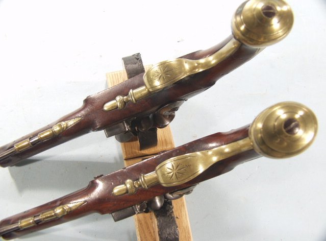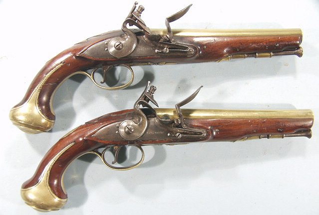 PAIR OF GEORGE III BRASS BARRELLED FLINTLOCK HOLSTER PISTOLS BY DANIEL GOFF OF LONDON, CIRCA 1779.