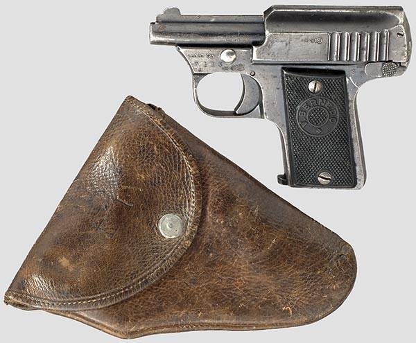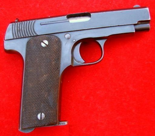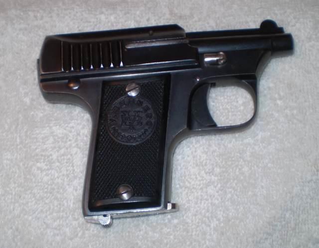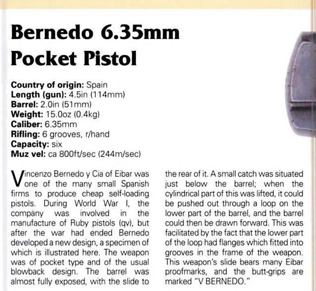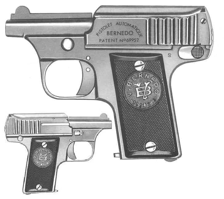 The pistol pictured is PATENTED in 1919 by VICTOR BERNEDO, "PISTOLET AUTOMATIQUE / BERNEDO / PATENT 69952" it has a 7-shot magazine, in calibre 6,35mm.