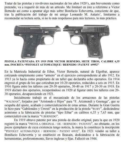 Early on he made Walman pistols made by Aristondo and Hijos for Arizmendi y Goenaga. Bernedo assembled them and also was a retailer (and remade some of them just using the frames).