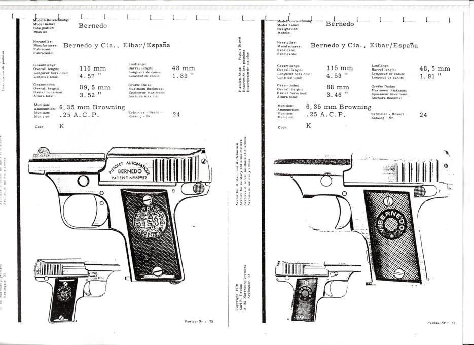 Early post-War manufactured pistols based on the 1919 patent was marked 1920 PISTOLA ORIGINAL DE BERNEDO PATENTE but these are scarce and most are marked PISTOLET AUTOMATIQUE/BERNEDO/PATENT 69952.