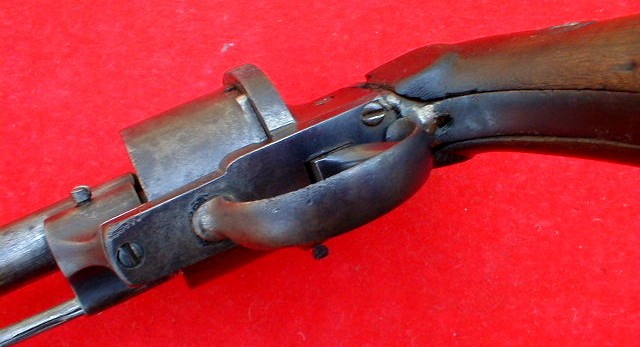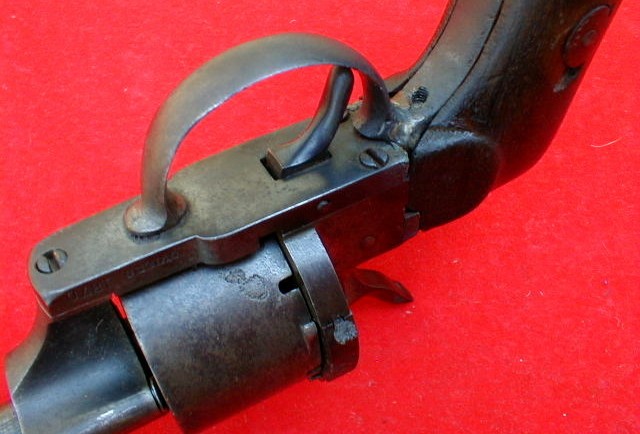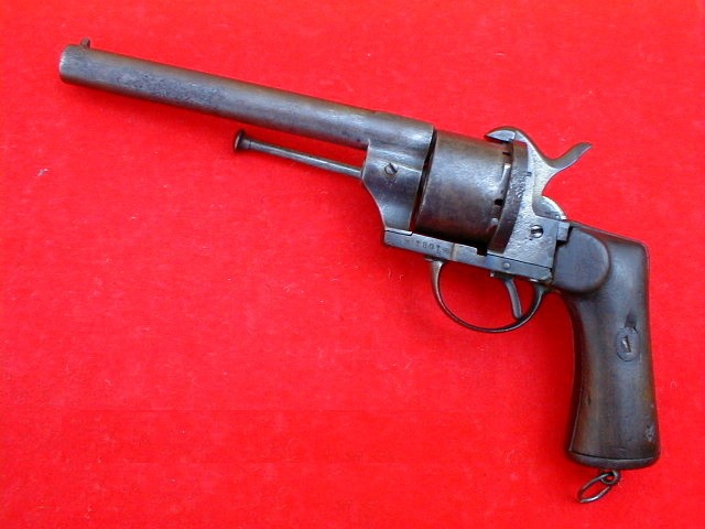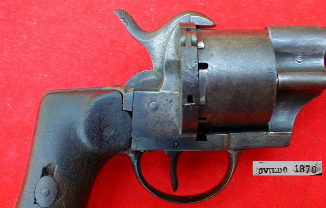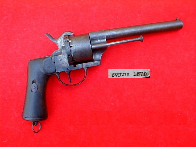 Spanish military Lefaucheux type pinfire revolver. This model was manufactured exclusively for the Spanish Army. Made by the State Factory in Oviedo in 1870, as indicated by markings on the right side of the frame. The revolver loosely follows the French M.1858, except for a shape of the grip and Belgian-style frame. Open top design. Single action. The revolver had seen a service with Spanish continental army until 1888 and with Spanish colonial forces until the turn of the century. Many revolvers of this type were captured during the Spanish American War in Cuba and Philippines. Cal. 11 mm pinfire.