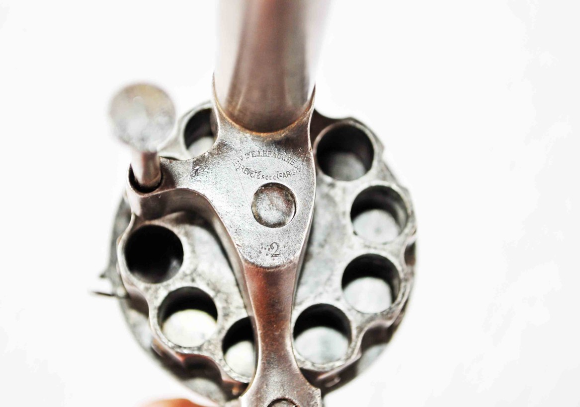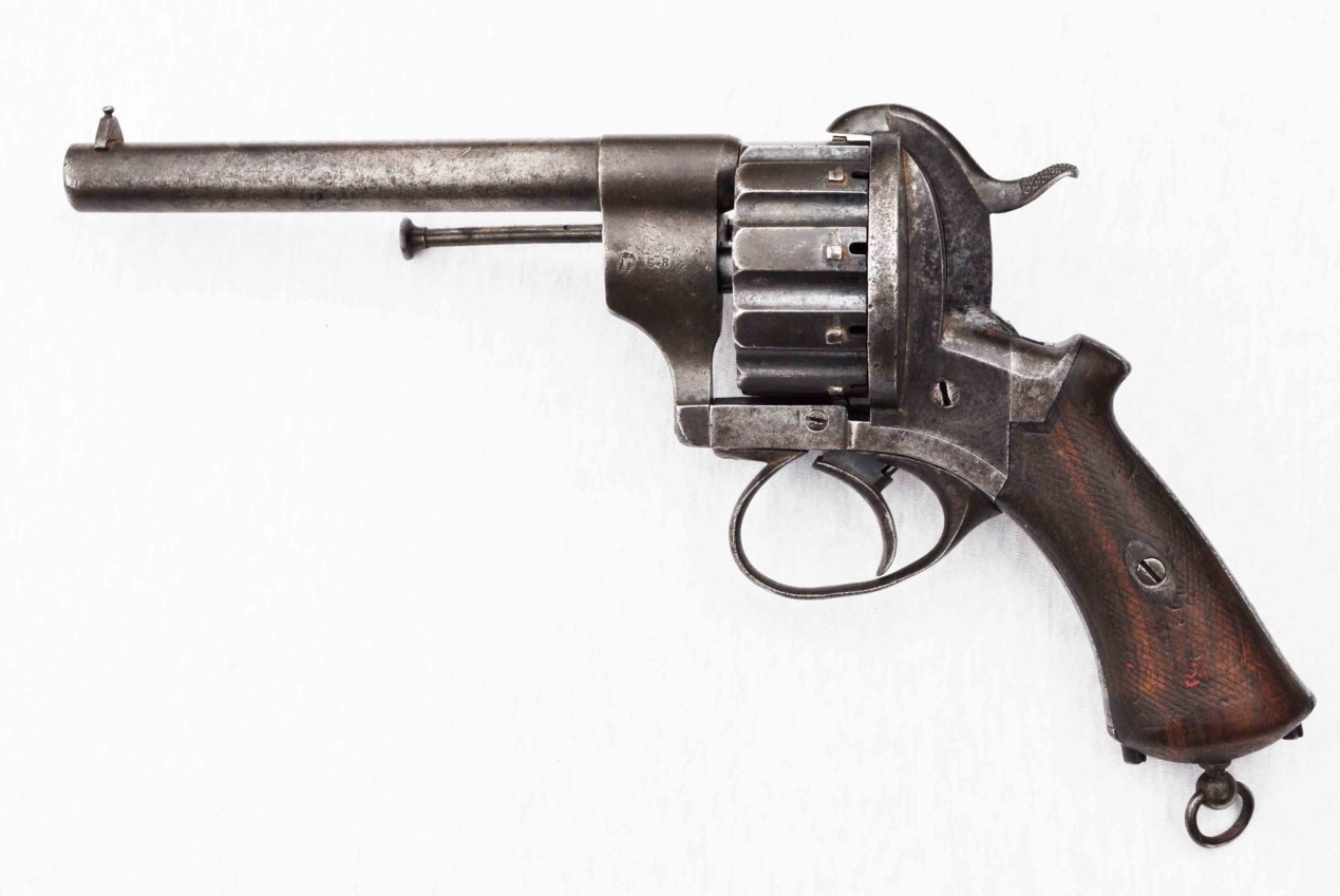 Revolver 12 mm à broche avec un mécanisme en triple action, issue du brevet de 1862.