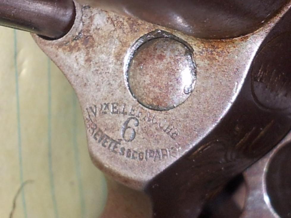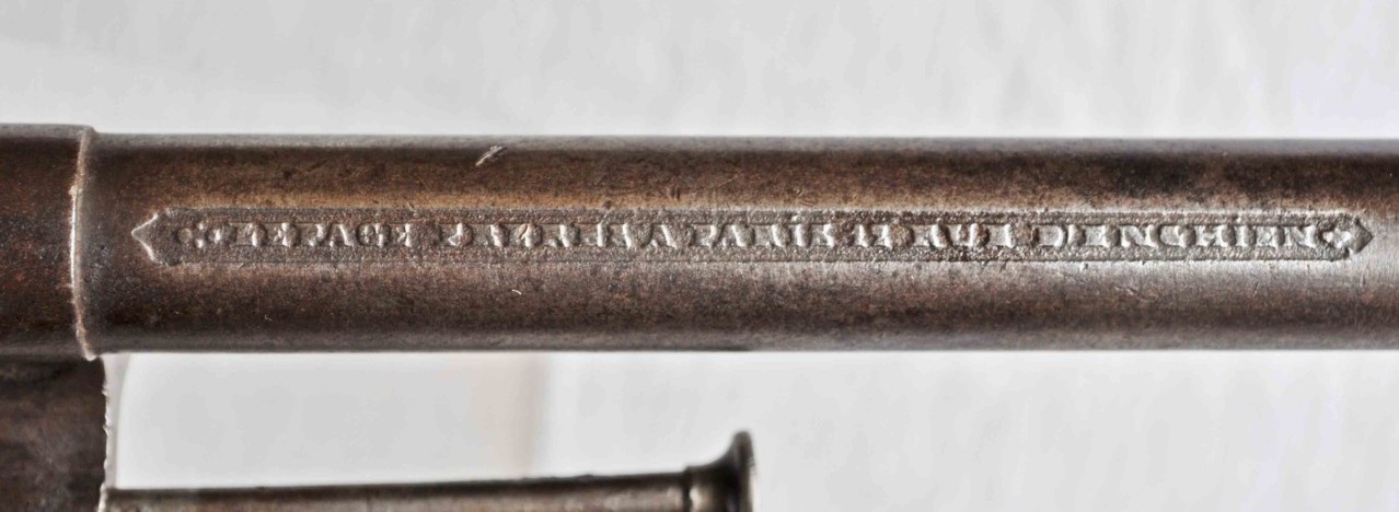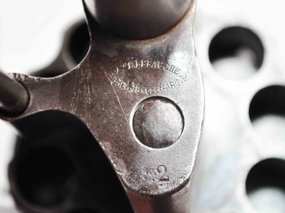 Le "Invon E. Lefaucheux breveté s.g.d.g. à Paris" sous le canon, au niveau de l'axe central prouve que l'arme a été fabriqué par Eugène Lefaucheux dans les ateliers du 104 rue Lafayette à Paris.