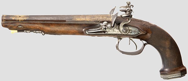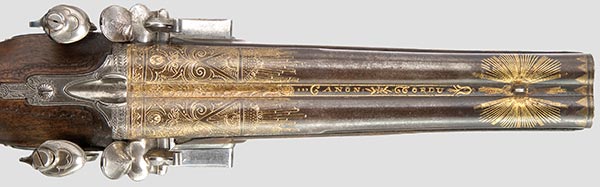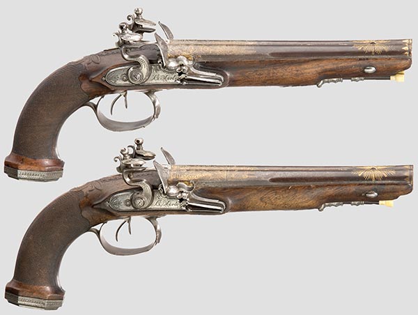 Paire de pistolets à silex à deux coups par G. Merley à St.Etienne, environs 1800.