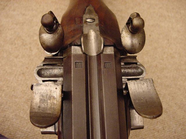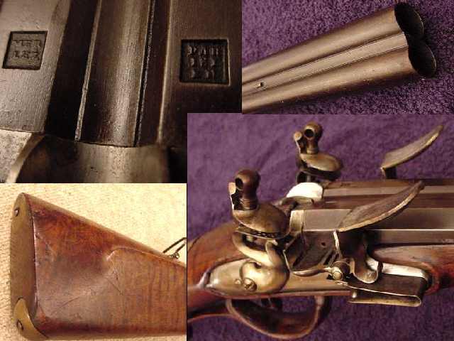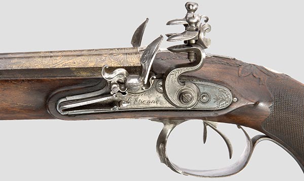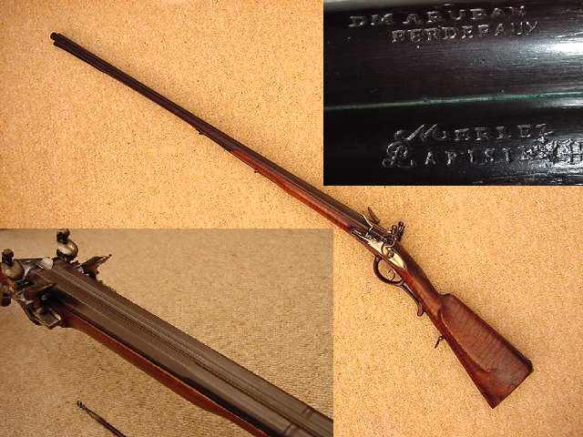 Décoration dorée sur les canons et les côtes portent la mention "canon Tordu" (Damas Twist). Les platines sont gravées, les bassinets sont imperméables à l'eau et les platines soutiennent la signature, "G. Merley".