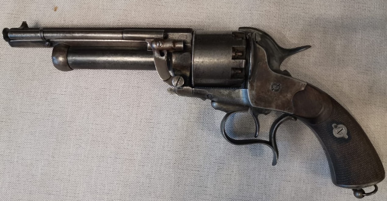 On October 21st, 1856, Le Mat was granted patent n° 15925 for his revolver. The patent describes a very particular feature of these revolvers, which is that the axis around which the cylinder revolves, is not a simple axis but an additional barrel. Also, the possibility for the user to fire at will the normal or the additional barrel.