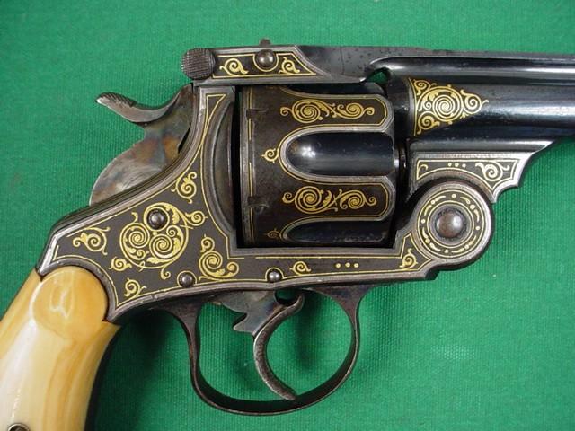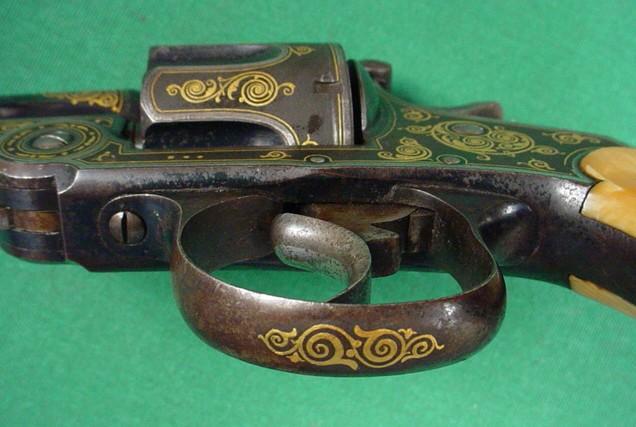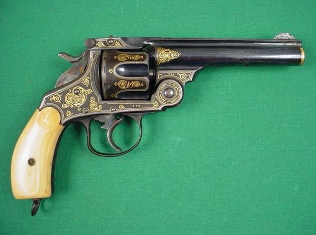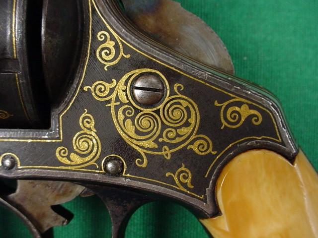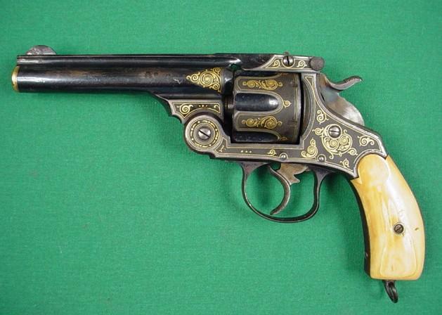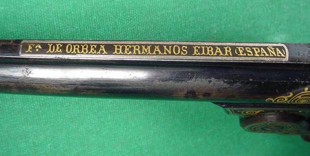 Manufactured in Spain circa 1880. 44 Russian caliber. Barrel top marked "Fa DE ORBEA HERMANOS EIBAR SPAIN ". 5 inch barrel. 9 1/2 inch overall length. Nicely decorated with gold and silver inlaid scrolls on frame, barrel and trigger guard. Ivory grips.