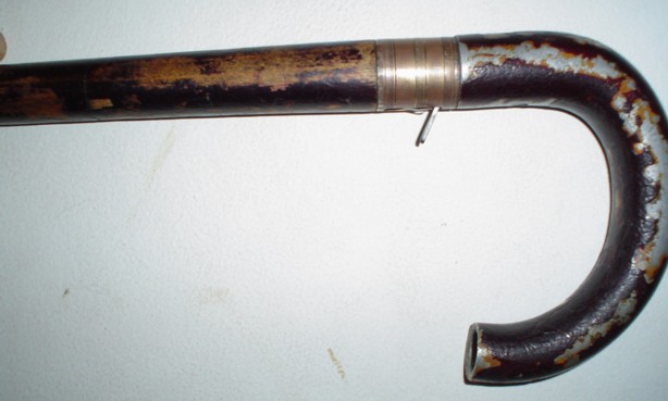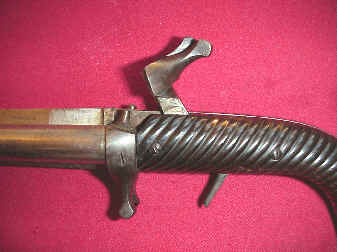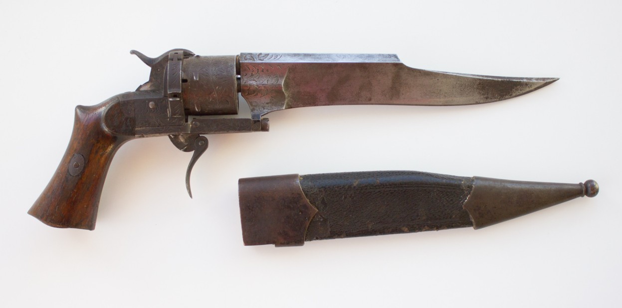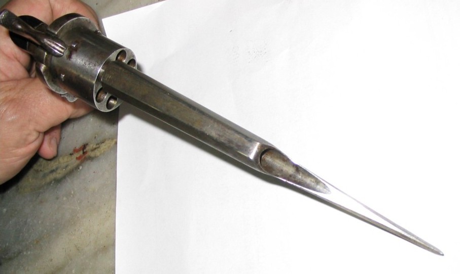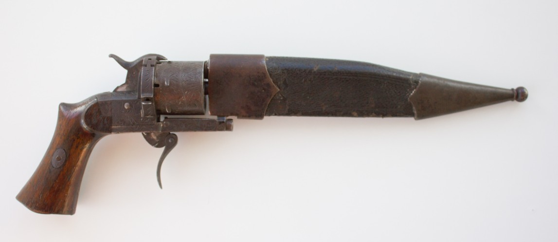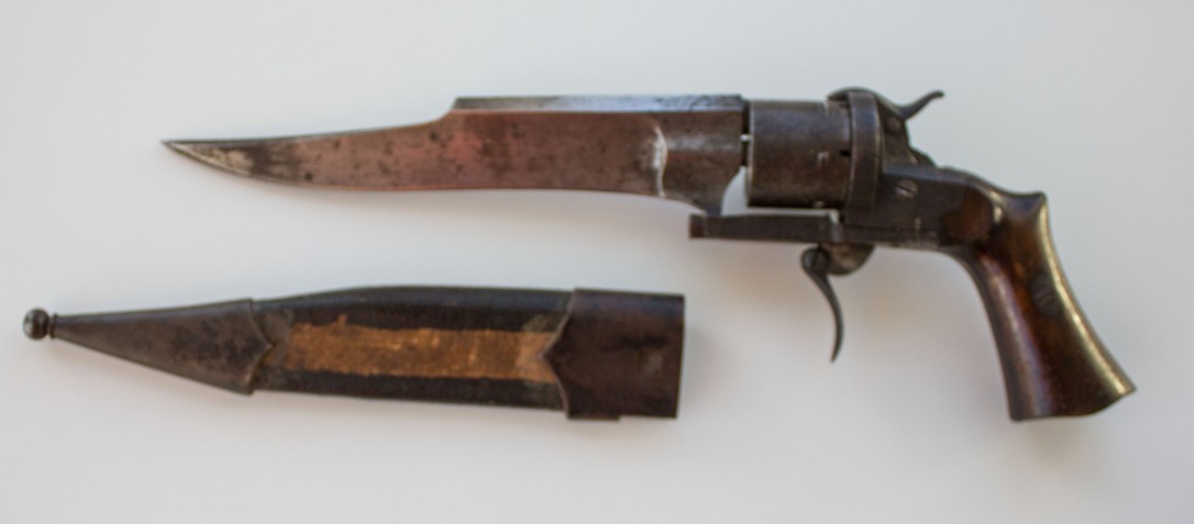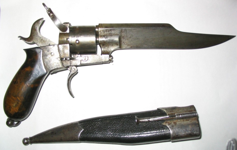 Double Barrel Percussion "Knife Pistol": .36 cal. perc., 2-shot, 3 1/2" round barrels on each side of 8" double edge blade. The two percussion cap locks have unusual hammers, fired by a single folding trigger. When the blade is sheathed, the hammers seem to be simply cross guards but can be fired while still in the sheath. The blade is marked "Dumonthier de Paris" "Breveté".
