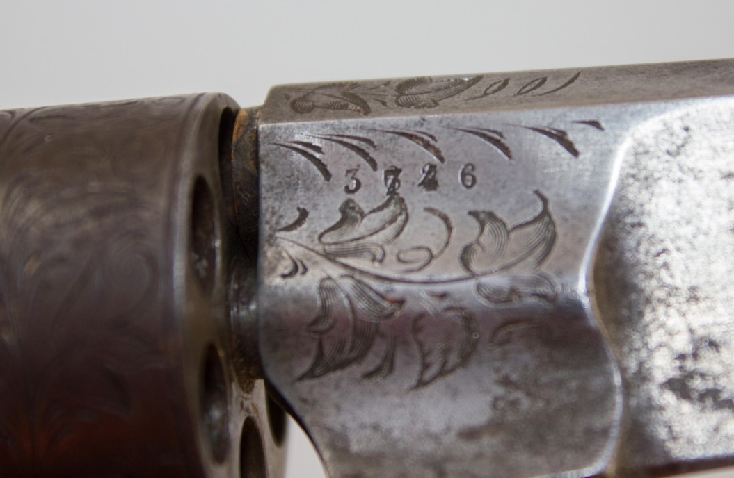 The whole of this pepperbox nicely is assembled and finished, all the weapon polished and is engraved with sheets, rinceaux and lianas.