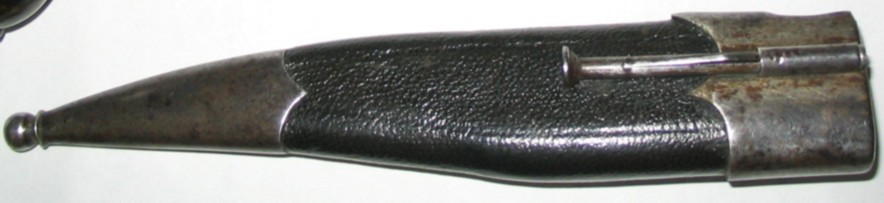 Made combination dagger with two barrel pistol, cal. circa .44 percussion. The blade from hilt to tip is 9¼" (235mm) long, the barrel length is 4". The black and distinctive grip is made from hard-rubber with a flat butt cap. While cocking the left or right hammer a trigger accordingly drops out of the frame. According to Frost's book, page 57 this type is called "Cardinal's pistol being under the assumption that various princes of the Catholic Church carried pistols of the nature with them for personal protection."