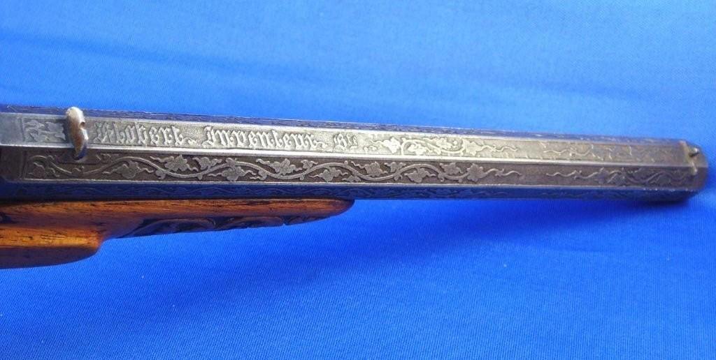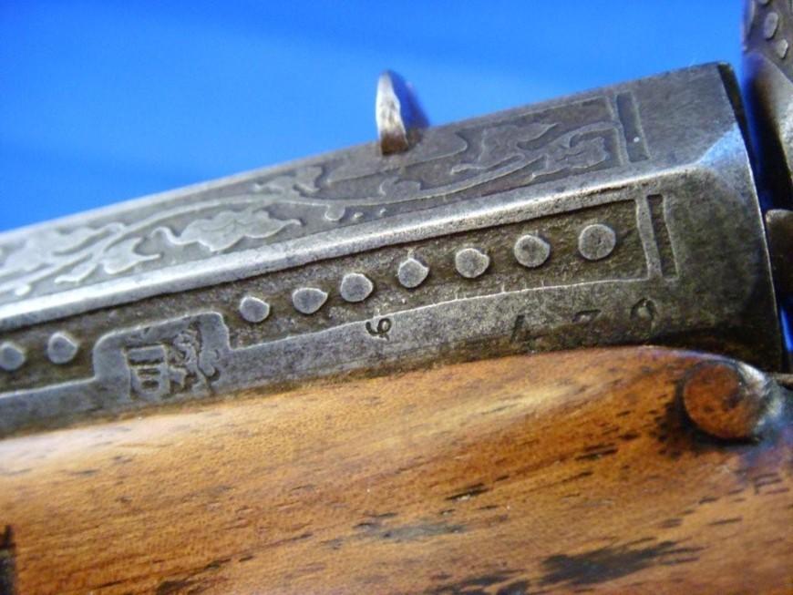 Tirant la munition 6 mm balle ronde. Canon acier fin à pans, chien avec extracteur intégré, crosse sculptée.