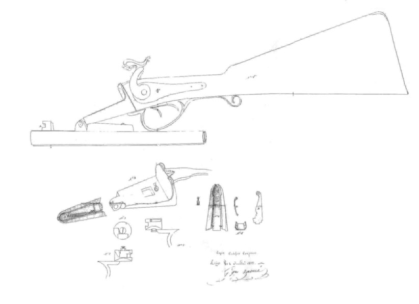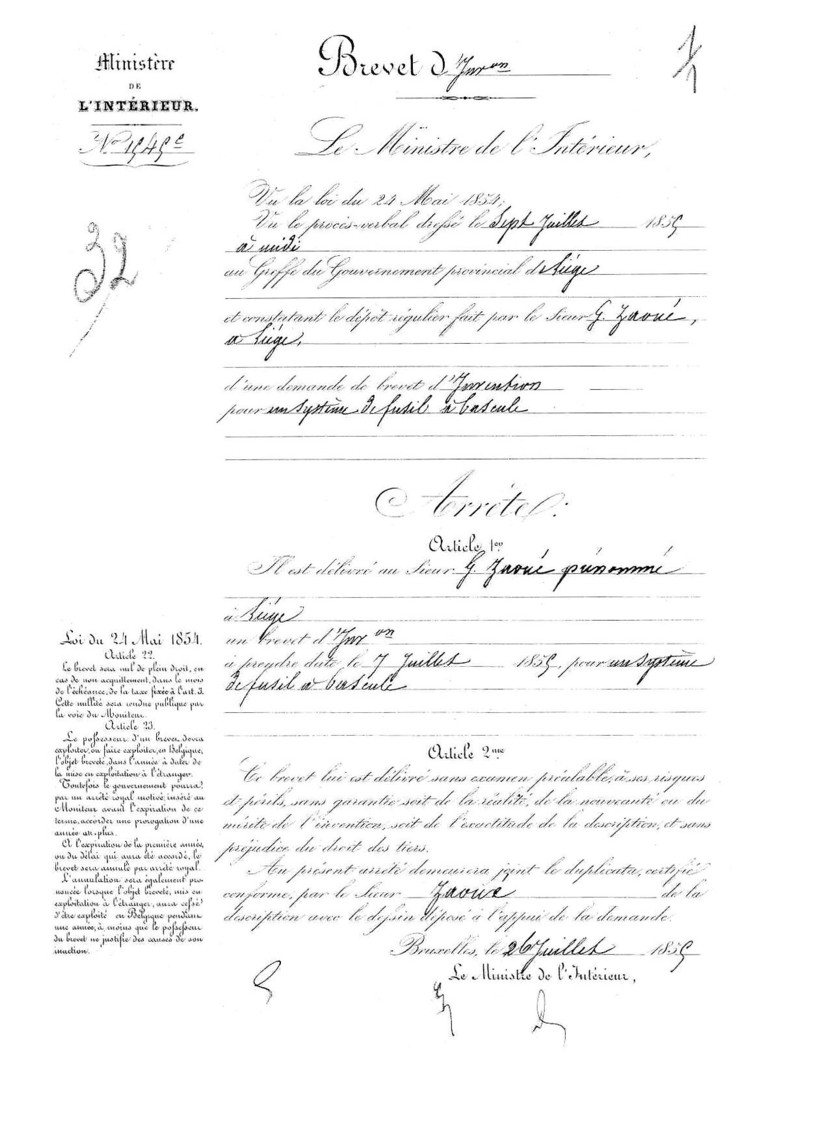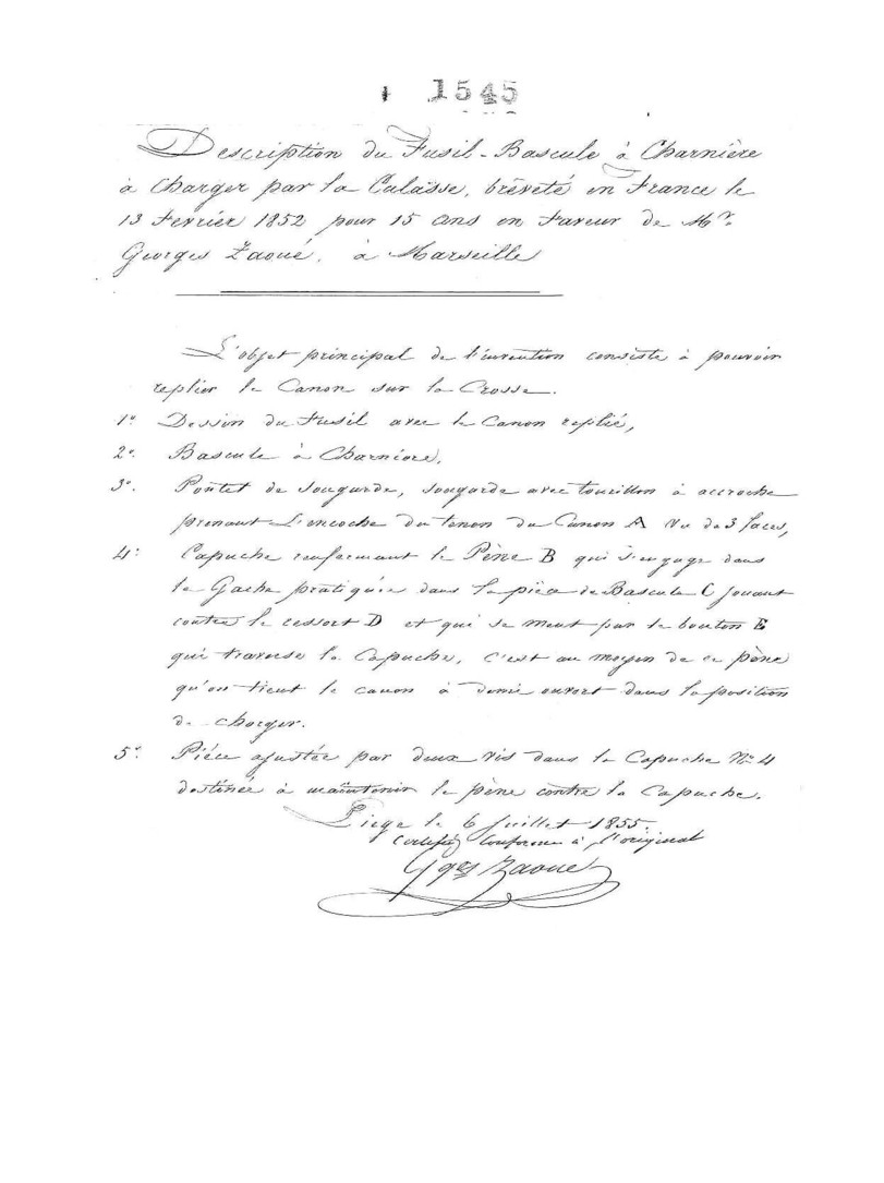Zaoué Georges , armurier a Marseille (Bouches du Rhône) 1841-1855. Brevet le 13 janvier 1852 pour un fusil a bascule avec charnière. Dépôt du même brevet en Belgique en 1855.