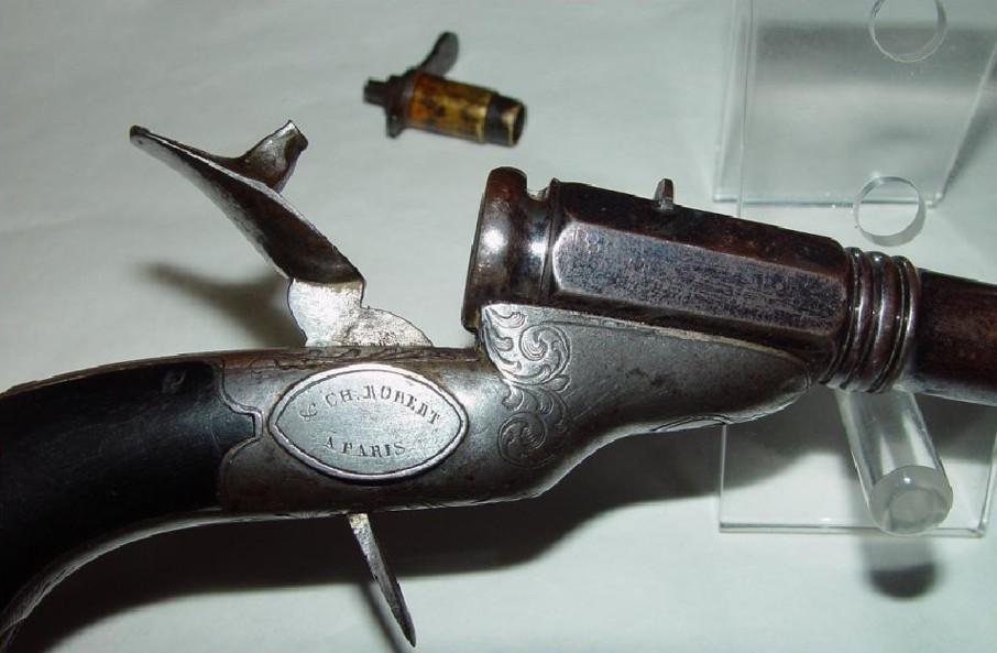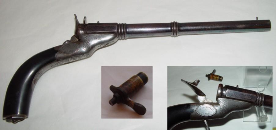 This elegant pistol of living room is approximately in calibre 8, system with percussion. Loading by the breech with a floating room, holding position by a species of locking of the bayonet type. The barrel has 8 sides side breech and is round then to the mouth. Raise and very simple handlebar. The ebony stick has a metal cap.