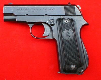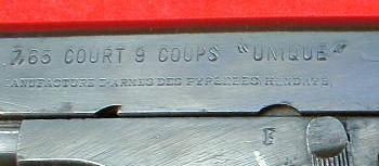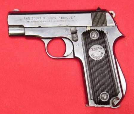 French blowback semi-auto pistol used by many military and government agencies. Basically, a variant of Unique Model C semi-auto pistol. Nine round magazine. Original black plastic grips with "RF" markings. Left side of the frame displays unidentified government property markings.