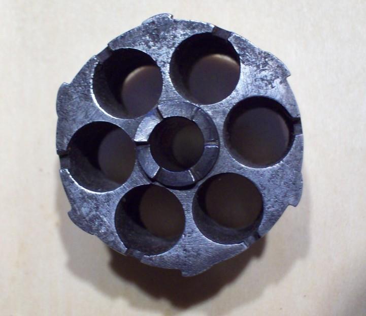 9mm pinfire, 5-shot rd. cyl., 6 1/4" rd. and oct. bbl. The barrel retains a post front sight and the hammer is notched for the rear sight.