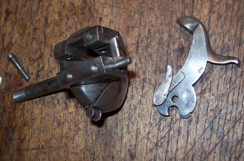 Square iron slide which contains the obturator, which is locked into position by a springloaded cam. The main spring also operates the firing pin.