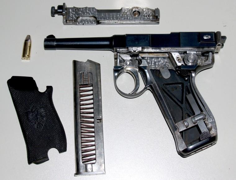 For this reason, perhaps, the first model of the automatic pistol Glisenti was manufactured in caliber 7,65 with a bottle-shaped cartridge case identical to the 7.65 Parabellum (30 Luger), but with less powder charge.