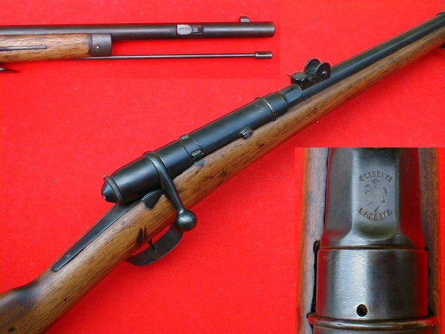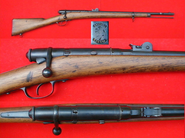 Italian Vetterli short rifle in its original single shot configuration. The rifle was issued to Italian "special forces" (Truppe Speciali). The chamber displays following markings, "GLISENTI, Rampant Lion, BRESCIA". Early pattern rear sight is graduated from 100 to 800 meters (for black powder). Bayonet lug is present on the right side of the muzzle.