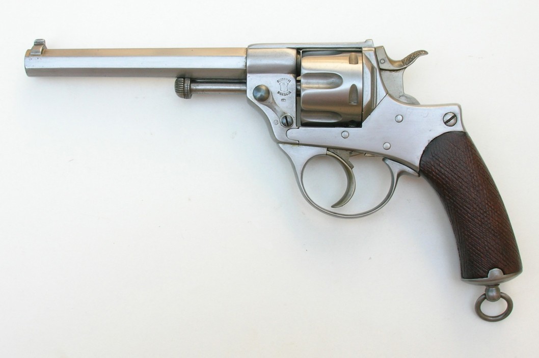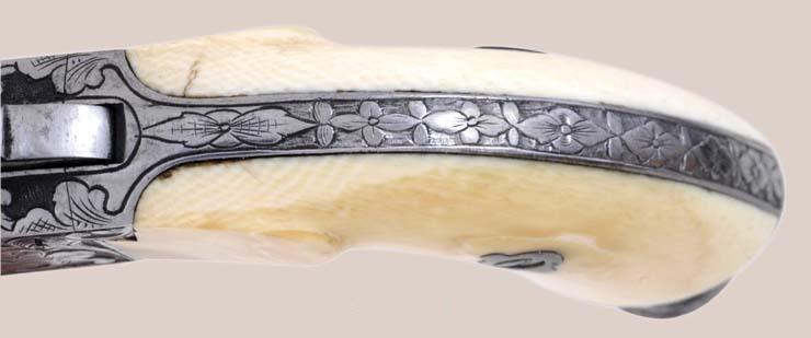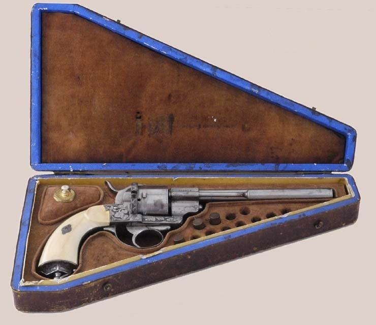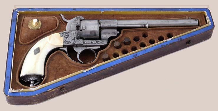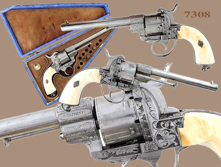 9mm pinfire, 5-shot rd. cyl., 6 1/4" rd. and octagonal barrel. The barrel retains a post front sight and the hammer is notched for the rear sight. This fine pistol is finished in the white with relief factory engraving on the barrel, frame, back strap, hammer, etc. and is fitted with a lanyard ring in the butt stock. Two-piece ivory grips. The pistol is cased in a French style fitted case of maroon velour interior. Brown leatherette exterior. The interior has a small compartment with gold and ivory handle and 12 holes for cartridges.