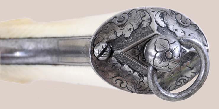 This fine pistol is finished in the white with relief factory engraving on the barrel, frame, back strap, hammer, etc. and is fitted with a lanyard ring in the butt stock. Two-piece ivory grips.