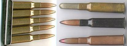 A gauche, un clip chargé; à droite, de bas en haut: originale 7.62x54mm R cartouche de 1891 et cartouche d’avant 1908 (milieu avec étui acier, en bas avec étui laiton).
