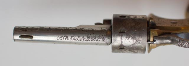 The resemblance of these little guns to the Colt open frame pistols of the cap and ball era is clear. Flipping a latch in front of the cylinder is all that is required to remove the barrel assembly and then the cylinder.