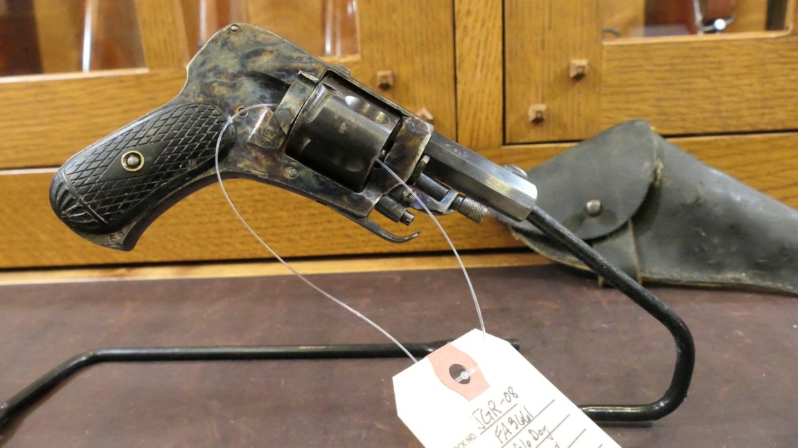 barrel, its checkered grips in fairly good condition, and its safety located at