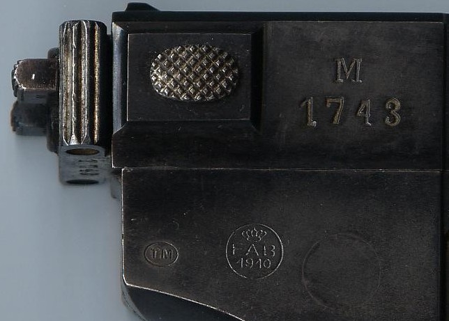 On the right side of the gun, above, is stamped the serial number of the weapon and, in a circle, C/Fab1910. “Fab” means “Fabbrica d’Armi di Brescia” (Weapons Factory – Brescia) and 1910 indicates the year of adoption of the weapon. Interestingly is the fact that on the first 5000 pistols, from A1 to C1000, circa, there is, in a circle “C/Fab 1909", rather “C/Fab1910”; this means an acquisition before the official adoption.