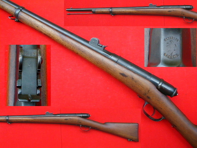 Italian Vetterli short rifle in its original single shot configuration. The rifle was issued to Italian "special forces" (Truppe Speciali). The chamber displays following markings, "GLISENTI, Rampant Lion, BRESCIA". Early pattern rear sight is graduated from 100 to 800 meters (for black powder). Bayonet lug is present on the right side of the muzzle.
