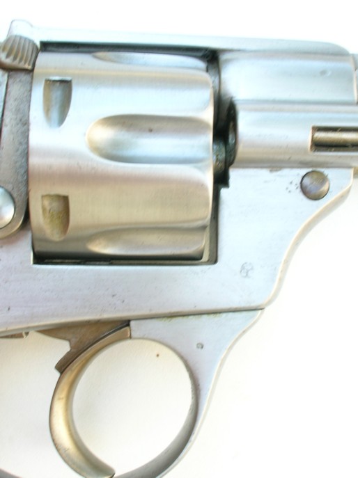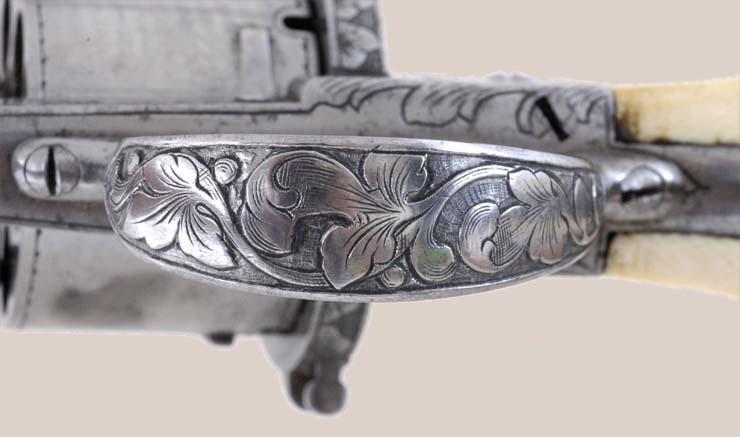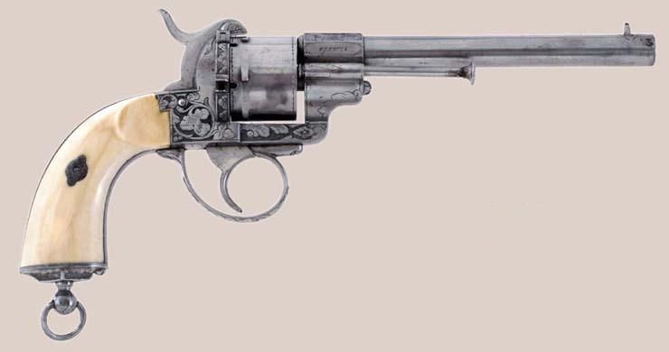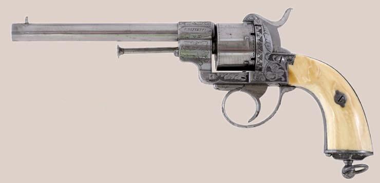 9mm pinfire, 5-shot rd. cyl., 6 1/4" rd. and octagonal barrel. The barrel retains a post front sight and the hammer is notched for the rear sight. This fine pistol is finished in the white with relief factory engraving on the barrel, frame, back strap, hammer, etc. and is fitted with a lanyard ring in the butt stock. Two-piece ivory grips. The pistol is cased in a French style fitted case of maroon velour interior. Brown leatherette exterior. The interior has a small compartment with gold and ivory handle and 12 holes for cartridges.