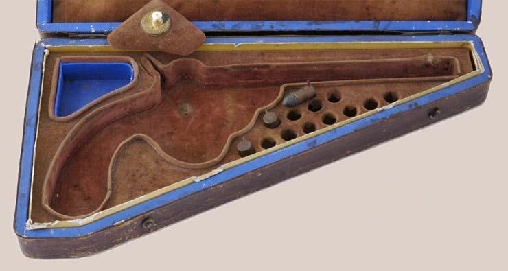 The pistol is cased in a French style fitted case of maroon velour interior. Brown leatherette exterior. The interior has a small compartment with gold and ivory handle and 12 holes for cartridges.