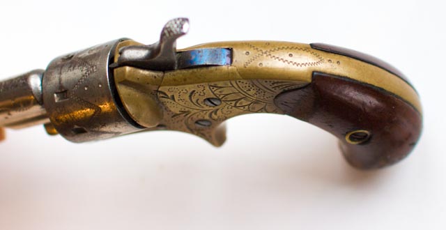 The resemblance of these little guns to the Colt open frame pistols of the cap and ball era is clear. Flipping a latch in front of the cylinder is all that is required to remove the barrel assembly and then the cylinder.
