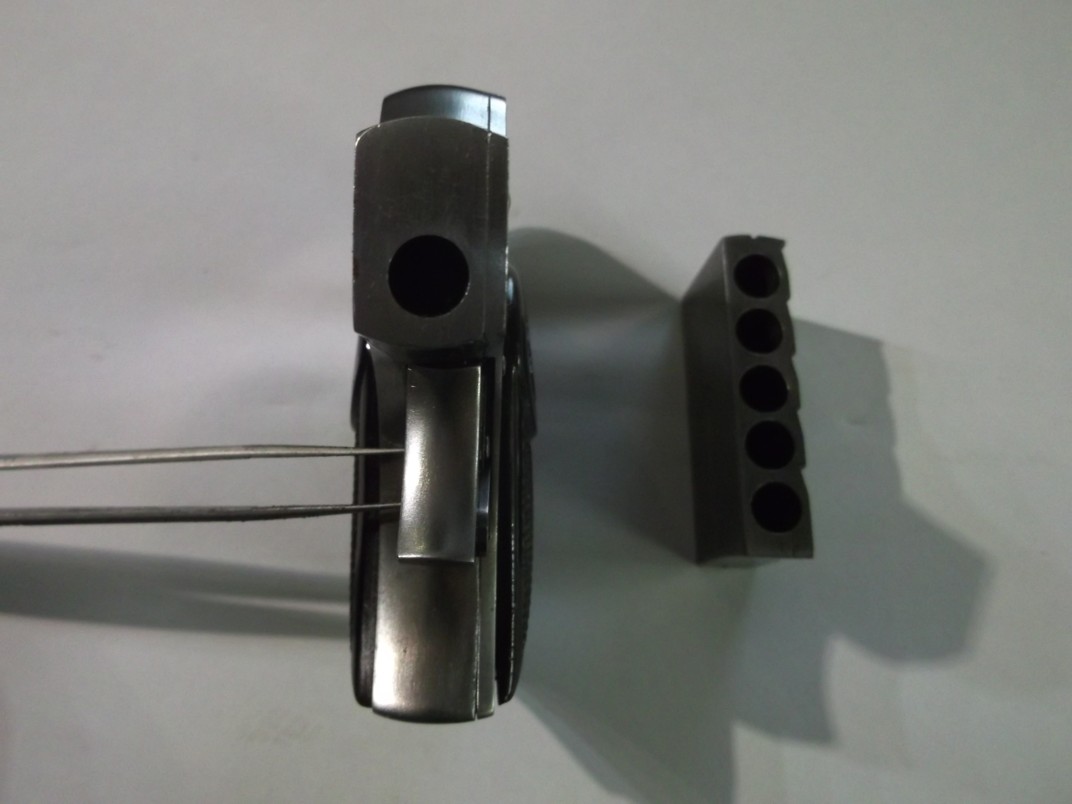 curious five-shot sliding-action pistol, marked Baby Dog on the grips. We also