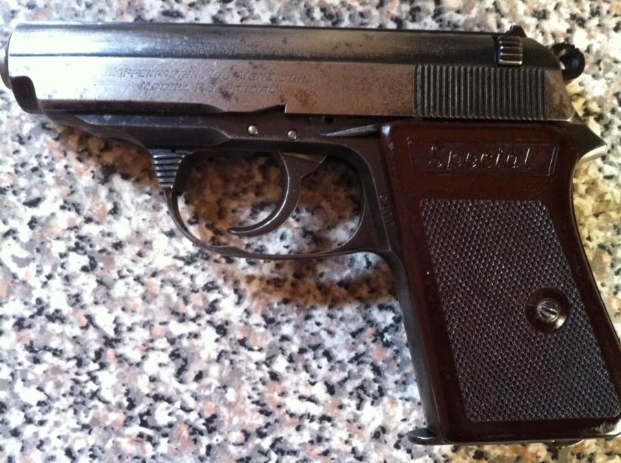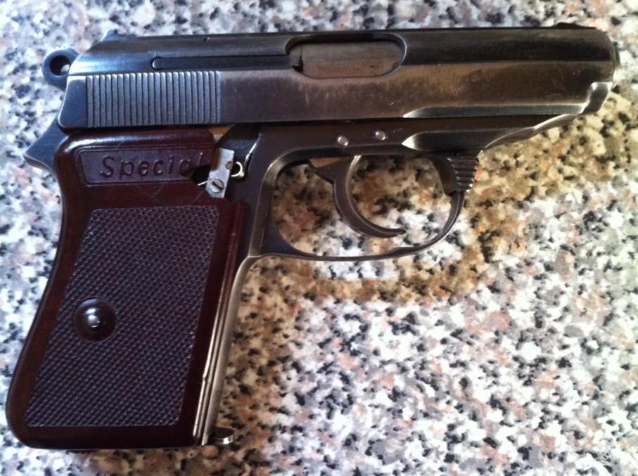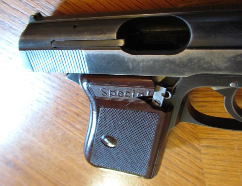 Calibre 7.65 mm, 8-shot. Proof-marked crown/"N". Double-action trigger, firing pin safety. Left on slide 2-line inscription "WAFFENFABRIK AUG. MENZ SUHL / MODELL P.B. 'SPEZIAL'" with "P.B." standing for "Polizei und Behörden".