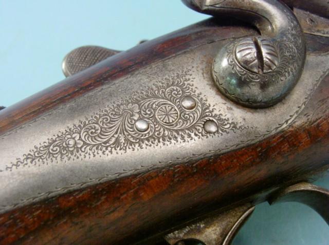 Calibre .45/16, canons de 27 pouces. Armature et platines finement gravées de rouleaux. Double set de détente. Sûreté de pouce. Crosse pistolet en noyer avec quadrillage à l'avant et au poignet. Plaque de couche en caoutchouc dur. Anneau avec bretelle en cuir.