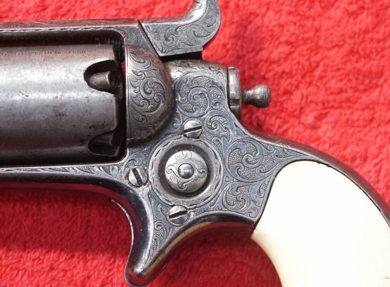 Le 2nd modèle est toujours au calibre .28 (.265), a toujours un barillet rond, et est le seul à avoir la main pointée devant le marquage du canon. La vis de maintien de la goupille se trouve à droite. Le barillet a l'ancien marquage "colt's patent n° (n° de série)" dans une bannière dans la gravure du barillet. L'ouverture de chargement n'est pas fraisée.