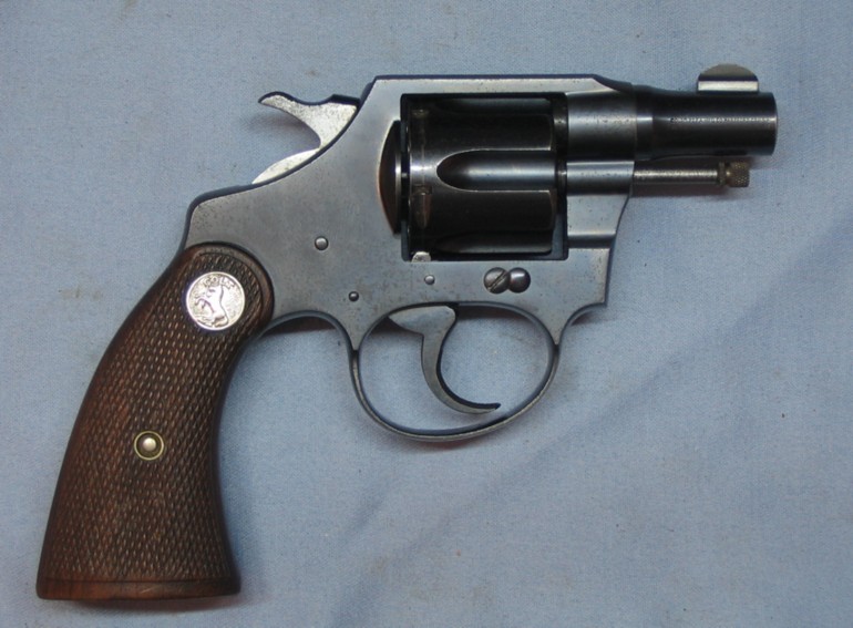 Les photos sont d'un Colt Banker’s Special dans ma collection personnelle. Il a le n° de série 355856 et est en très bon état avec seulement un peu de rouille extérieure du côté droit. Il a le canon de deux pouces et une longueur totale de 6 1/2 pouces. Ce qui a rendu ces colts populaires et facile à employer était le fait que le canon est court mais qu’ils ont des poignées normales, il est ainsi facile à manipuler, et étonnamment précis.